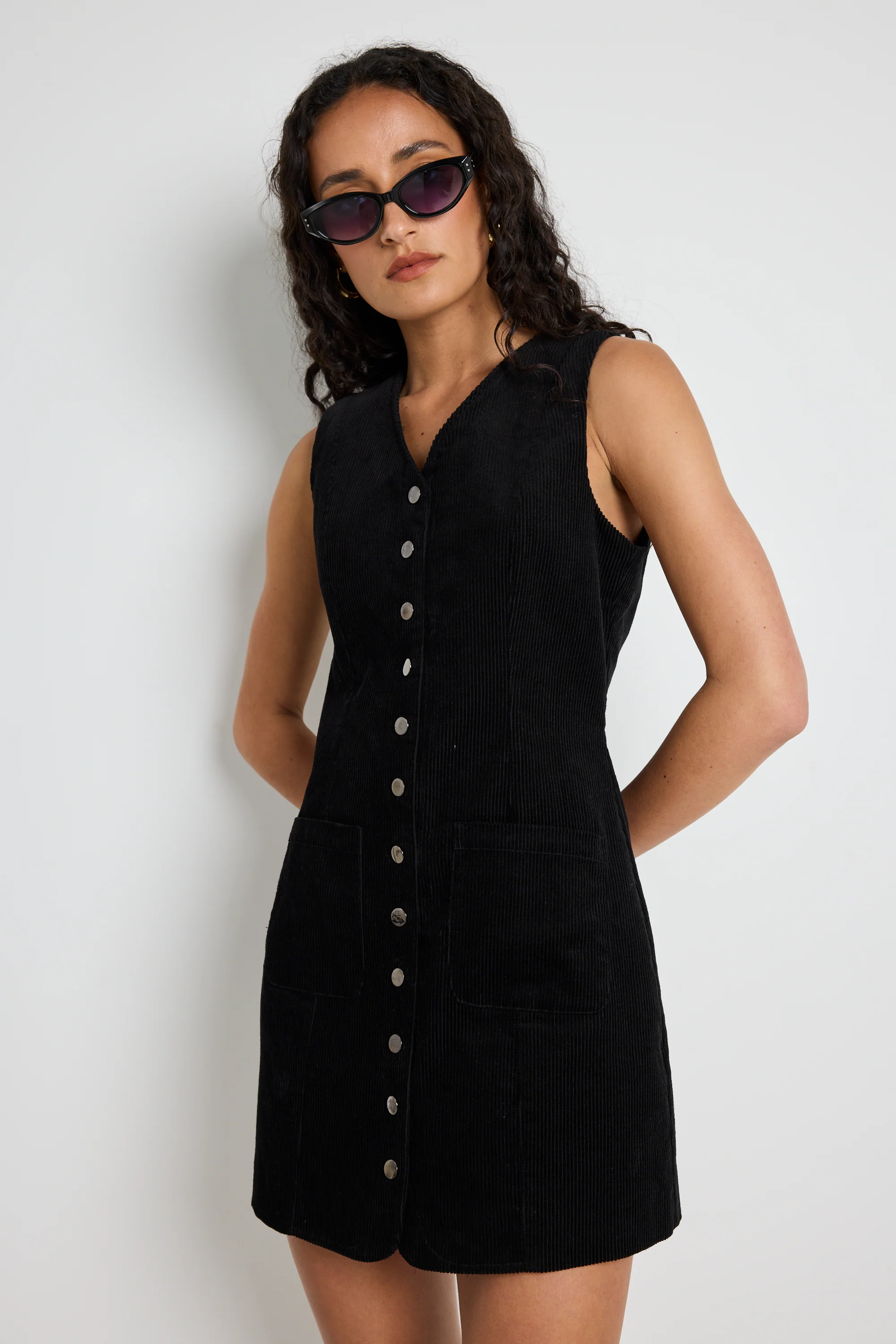 Effortlessly chic with a touch of vintage charm, the Direction Black Cord Dress is your go-to for versatile style. Crafted from soft corduroy fabric, this sleeveless mini dress features a flattering V-neckline and bold button-down front.