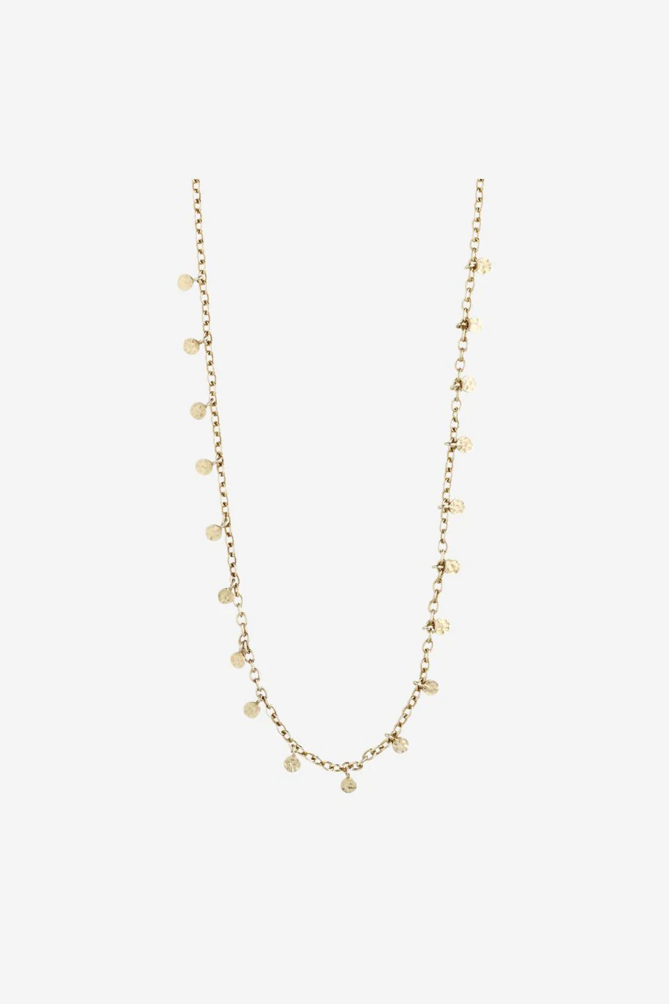 Feminine silver-plated necklace with small round polished pendants along the chain. The delicate necklace is 40 cm long with a 9 cm extension chain. The design was inspired by classic exotic jewellery, and the necklace is the perfect contrast to an edgy outfit. Let your femininity shine through with this charming classic.