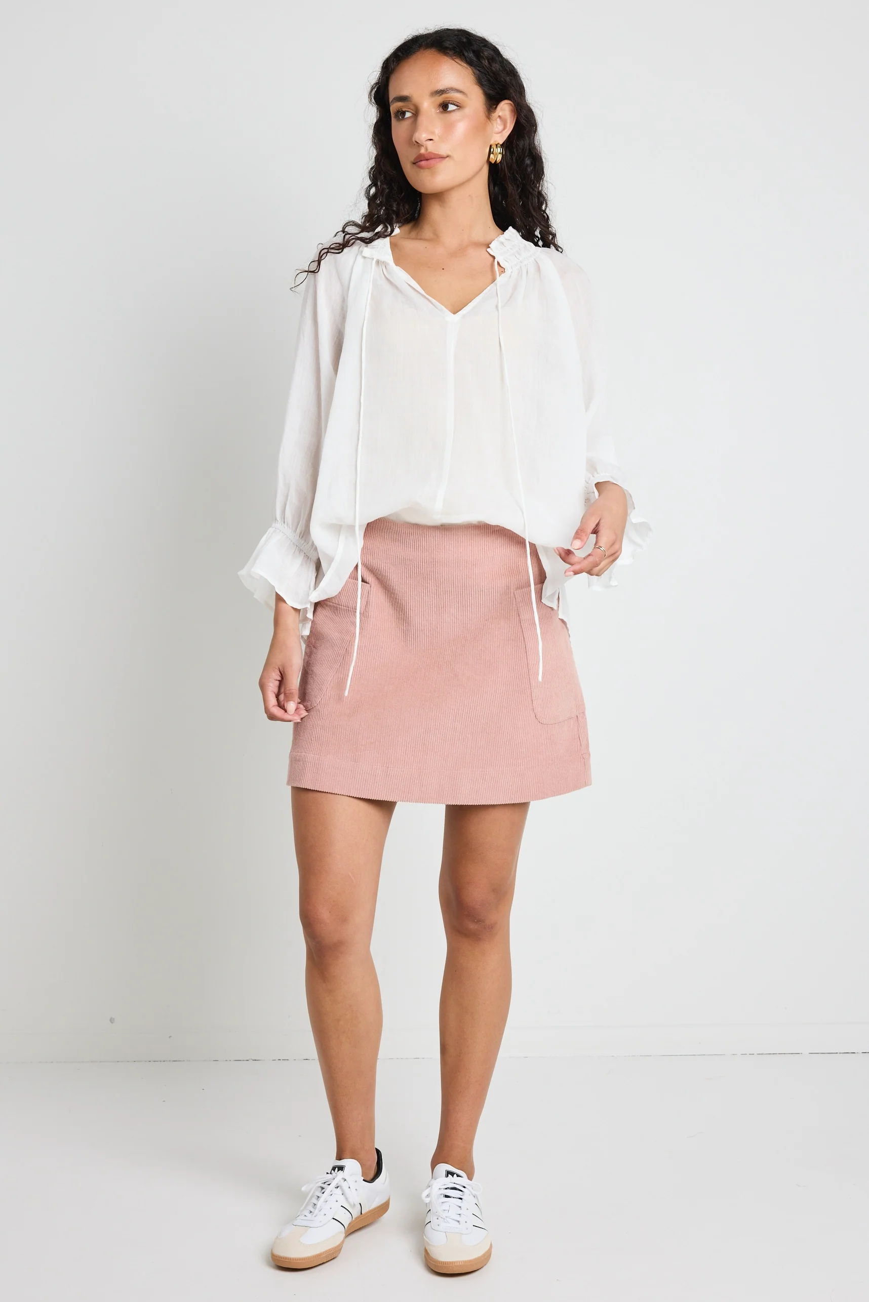 Effortlessly chic and playfully feminine, the Valid Blush Mini Skirt is a must-have for your wardrobe. Its soft corduroy texture and delicate blush hue add a touch of vintage charm, while the A-line silhouette creates a flattering, leg-lengthening effect. Perfect for high-low dressing, pair it with sneakers for a laid-back vibe or style it with ballet flats and a blouse for an elevated look.