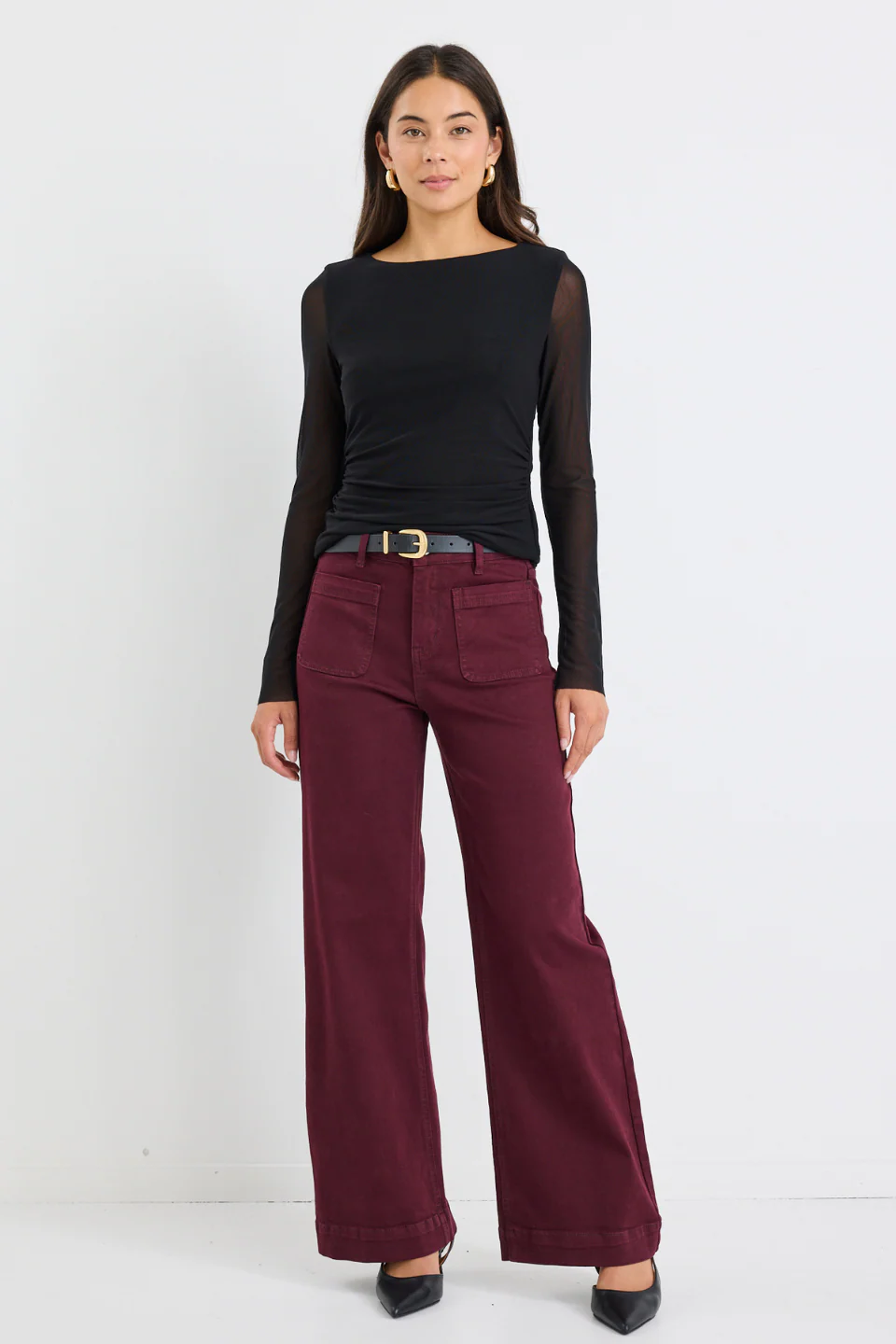 The Zoey Burgundy High Rise Wide Leg Pocket Jean is cut in a wide-leg shape with a high-rise waist. Made from stretch denim, it has front pockets, a zip fly, and button closure. The deep burgundy wash offers a fresh alternative to classic denim. Style with a fitted knit or neutral blouse for balance.